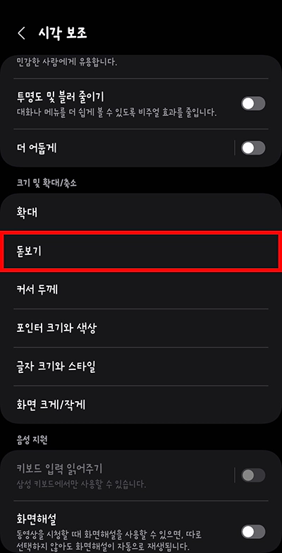 시각 보조 / 시인성 향상 메뉴 화면으로 넘어왔습니다. 화면에는 정말 많은 메뉴가 보이는데요. 아래쪽으로 스크롤하시면 돋보기 메뉴를 찾을 수 있습니다. 돋보기 메뉴를 터치해서 활성화해 보도록 하죠.